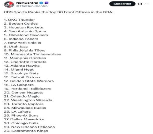 常规赛过半进入全明星周末之际,美媒《CBS》根据本赛季前半程最新表现重新评价NBA各队管理层水平排名,其中雷霆队毫无疑问高居第一,陷入困境的火箭队仍高居第3,勇士队17名,湖人仅排25位。